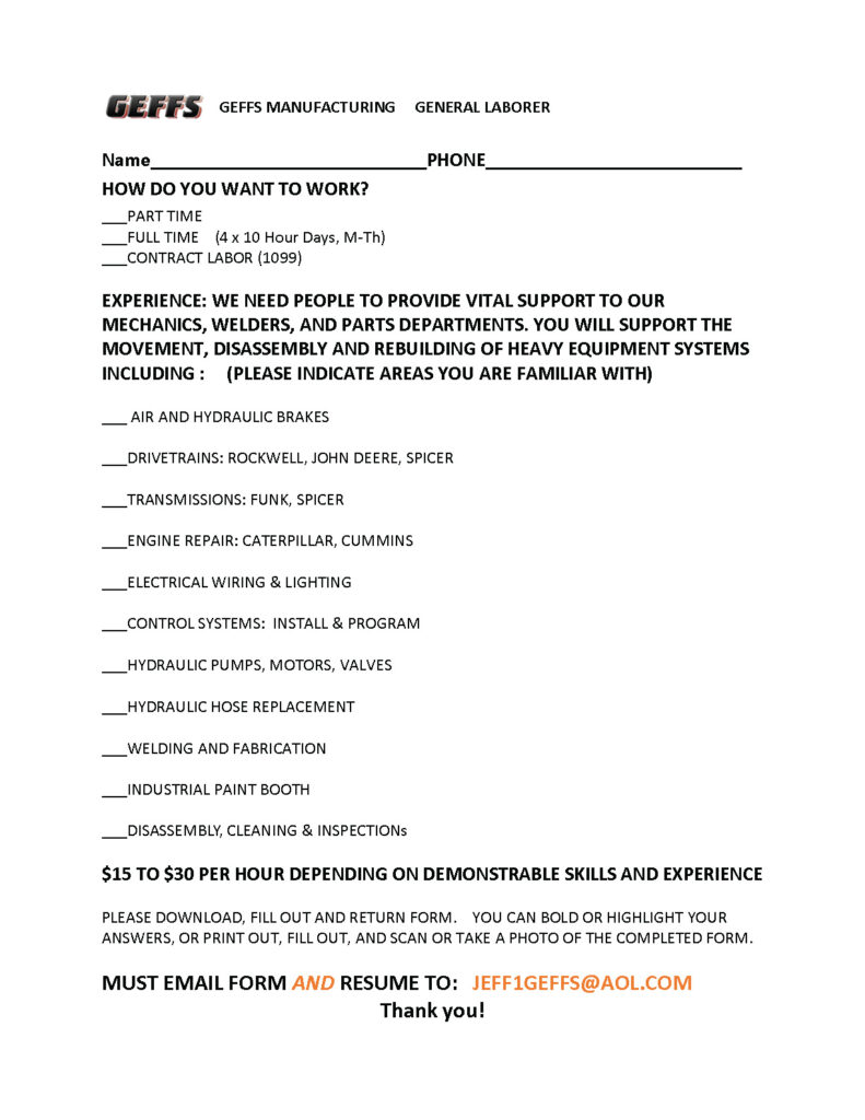 At GEFFSTM, you’ll join an expert team of hard working professionals who are leading the industry in rebuilding, repairing and restoring Used Chip Spreaders to like new condition. We have a successful program generating increasing demand. All we need to grow is you! If you’re looking for a real career, with a real local manufacturer, growing a long term business, we have opportunities for you.